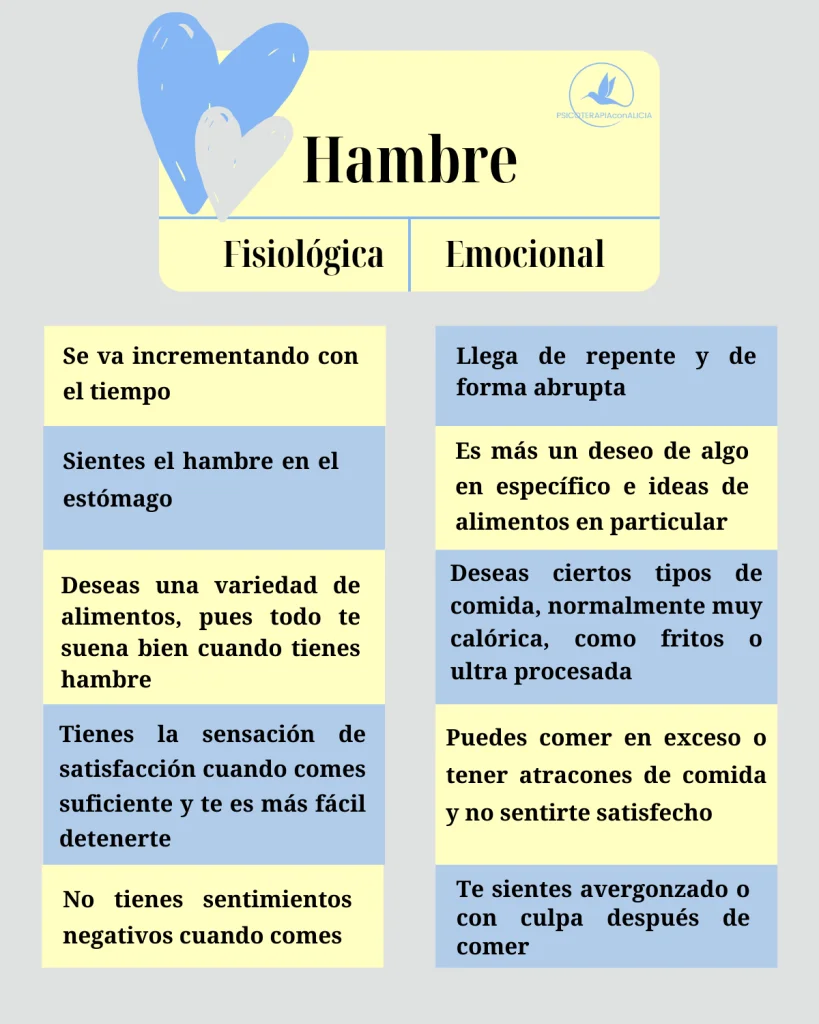 Aquí tienes un tabla para que puedas diferenciar el hambre emocional de la fisiológica.